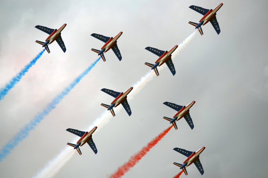 8月21日,在俄羅斯茹科夫斯基市舉行的第九屆國(guó)際航空航天展覽會(huì)上,法國(guó)著名的“法蘭西巡邏兵”飛行表演隊(duì)進(jìn)行了精彩的飛行表演。