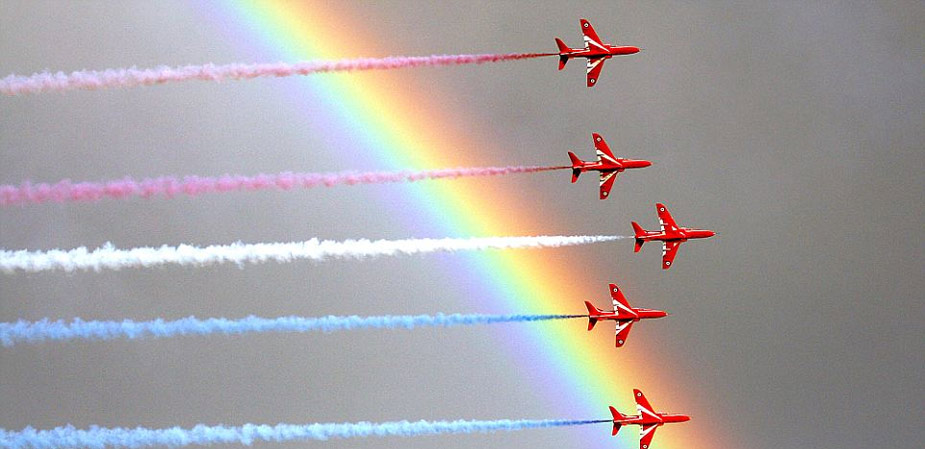 據(jù)英國(guó)媒體近日?qǐng)?bào)道,英國(guó)皇家空軍“紅箭”飛行表演隊(duì)20日在英國(guó)康沃爾郡福伊港進(jìn)行飛行特技表演時(shí),恰巧天邊出現(xiàn)一道彩虹,相映成輝,異常漂亮。