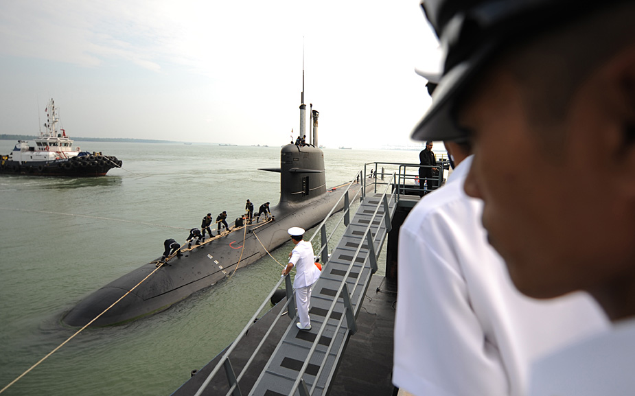 9月3日,由法國(guó)制造的馬來西亞首艘“鲉魚”級(jí)潛艇“東古·阿卜杜勒·拉赫曼”號(hào)駛?cè)腭R來西亞首都吉隆坡的克朗港。圖片來源:中國(guó)新聞網(wǎng)