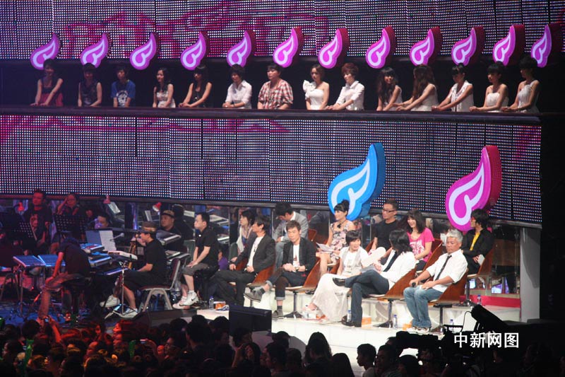 9月4日,湖南衛(wèi)視“2009快樂女聲”進行最后的總決賽。江映蓉、黃英、李霄云這3強選手將通過18首歌曲的演繹,向全國總冠軍發(fā)起最后沖擊。圖為現(xiàn)場的評審。劉雙雙攝