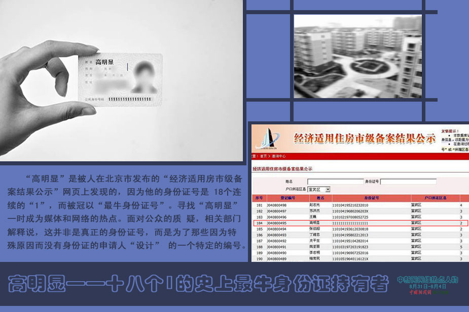 中新網(wǎng)本周熱點(diǎn)人物之——高明顯 “高明顯”是被人在北京市發(fā)布的“經(jīng)濟(jì)適用房市級(jí)備案結(jié)果公示”網(wǎng)頁上發(fā)現(xiàn)的,因?yàn)樗纳矸葑C號(hào)是 18個(gè)連續(xù)的“1”,而被冠以“最牛身份證號(hào)”。尋找“高明顯”一時(shí)成為媒體和網(wǎng)絡(luò)的熱點(diǎn)。面對(duì)公眾的質(zhì) 疑,相關(guān)部門解釋說,這并非是真正的身份證號(hào),而是為了那些因?yàn)樘厥庠蚨鴽]有身份證的申請(qǐng)人“設(shè)計(jì)” 的一個(gè)特定的編號(hào)。圖片來源:中青網(wǎng)、人民網(wǎng)、大河網(wǎng)