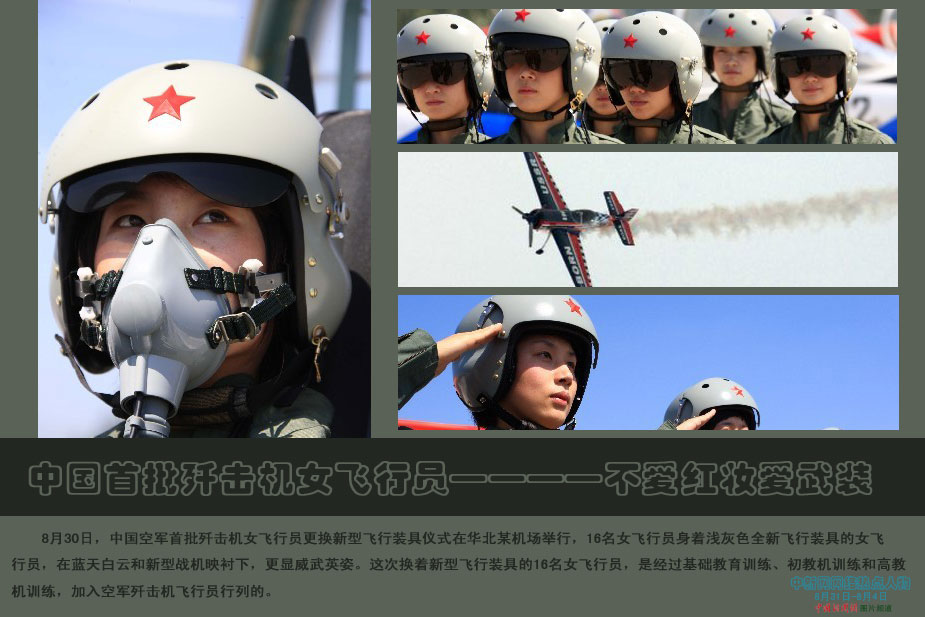 中新網(wǎng)本周熱點人物之——中國首批殲擊機女飛行員 8月30日,中國空軍首批殲擊機女飛行員更換新型飛行裝具儀式在華北某機場舉行,16名女飛行員身著淺灰色全新飛行裝具的女飛行員,在藍天白云和新型戰(zhàn)機映襯下,更顯威武英姿。這次換著新型飛行裝具的16名女飛行員,是經(jīng)過基礎(chǔ)教育訓(xùn)練、初教機訓(xùn)練和高教機訓(xùn)練,加入空軍殲擊機飛行員行列的。來源:中國新聞網(wǎng)