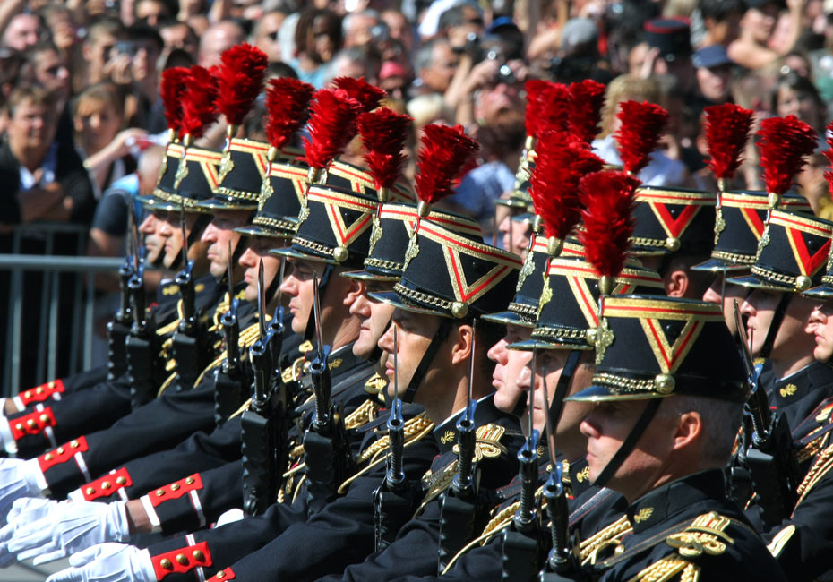 2009年7月14日,法國在巴黎香榭麗舍大道上舉行傳統(tǒng)閱兵儀式,慶祝該國國慶節(jié),圖為法國共和國衛(wèi)隊接受檢閱。