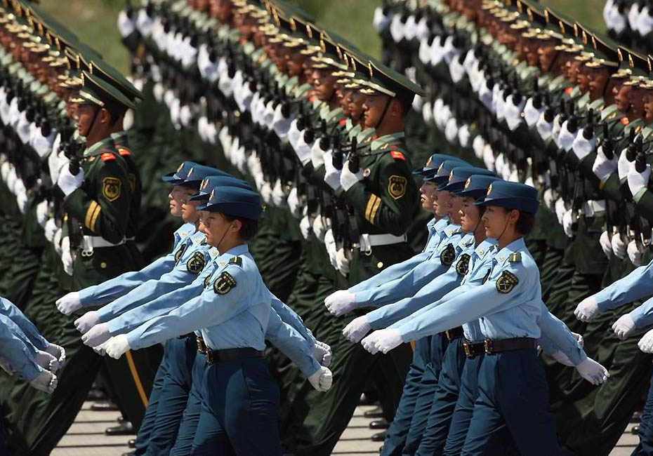 國慶60周年閱兵方陣中有三支“娘子軍”:三軍女兵方隊、女民兵方隊、女飛行員梯隊。這是新中國歷次閱兵中女兵方隊最多的一次,其中三軍女兵方隊和女飛行員梯隊是首次參加。圖片來源:新華網(wǎng)
