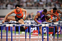 圖為領獎臺的翔飛人。在20日晚進行的上海田徑大獎賽的男子110米欄的比賽中,劉翔時隔13個月后重返賽場,并跑出13秒15的成績。美國名將特拉梅爾以13秒15的同樣成績、近乎為零的優(yōu)勢奪走冠軍。