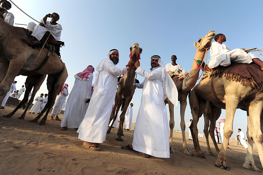 9月25日,在沙特阿拉伯東部的哈利斯,駱駝騎士們騎著自己的座駕在大漠中飛馳。圖片來源:中國新聞網