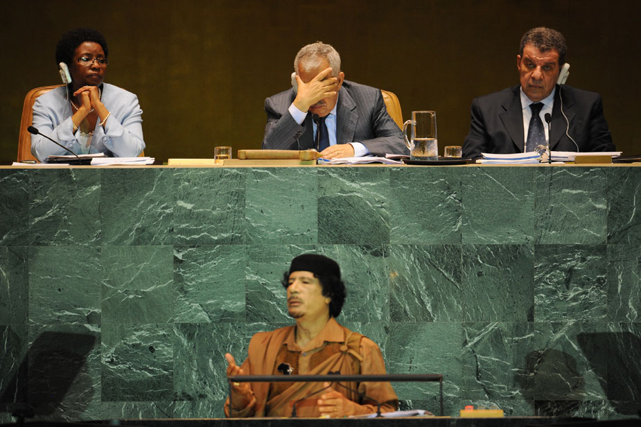 執(zhí)政40年來首次在聯(lián)合國亮相的利比亞領(lǐng)導(dǎo)人卡扎菲,23日在聯(lián)大一般性辯論上發(fā)表演講,強(qiáng)力攻擊安理會(huì)和聯(lián)合國的現(xiàn)有體制,并將原定15分鐘的演講拖到一個(gè)半小時(shí),很多國家代表團(tuán)成員最后堅(jiān)持不住,紛紛離開會(huì)議現(xiàn)場。圖片來源:中國新聞網(wǎng)