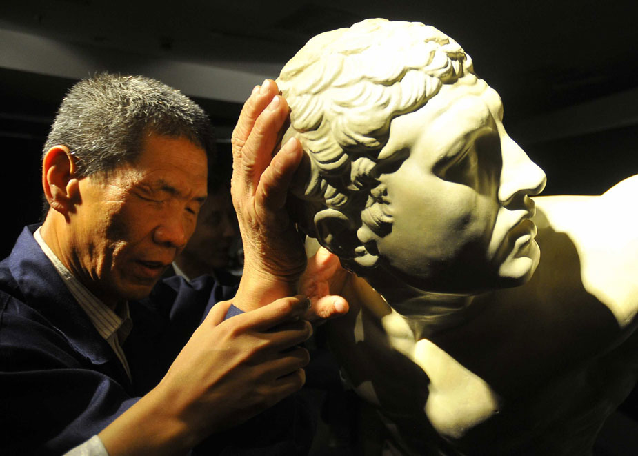 21日,由法國盧浮宮博物館、中華世紀壇世界藝術(shù)館等機構(gòu)聯(lián)合主辦的《觸·覺——從盧浮宮到世紀壇》藝術(shù)展在中華世紀壇世界藝術(shù)館開幕,共展出公元前二世紀到十九世紀西方經(jīng)典雕塑的復(fù)制品和中國當代藝術(shù)品二十三件。這是中國大陸首次為視覺殘障人士舉辦的藝術(shù)展。該展十一月起開始在福州、武漢及香港等地巡展。圖為視障人士利用觸覺方式欣賞精典作品。潘旭臨 攝圖片來源:中國新聞網(wǎng)