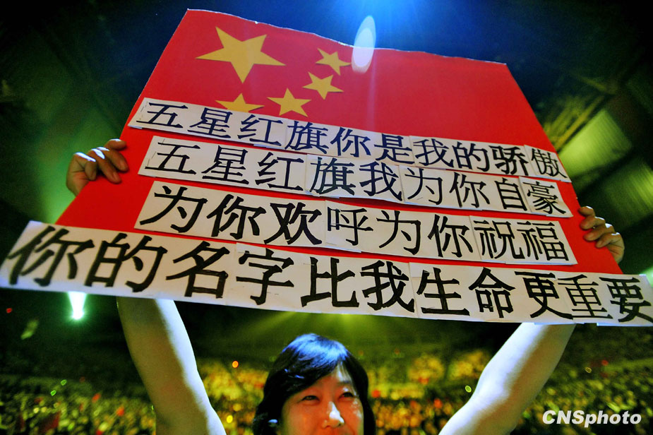 當(dāng)?shù)貢r(shí)間9月20日,以“感動(dòng)世界,中國(guó)有我”為主題的全球華人共慶新中國(guó)成立六十周年《同一首歌》——走進(jìn)美國(guó)舊金山大型演唱會(huì)圓滿落幕。 一位宮姓女士自制了一面五星紅旗,用獨(dú)特的方式祝福新中國(guó)六十華誕。 中新社發(fā) 陳鋼 攝