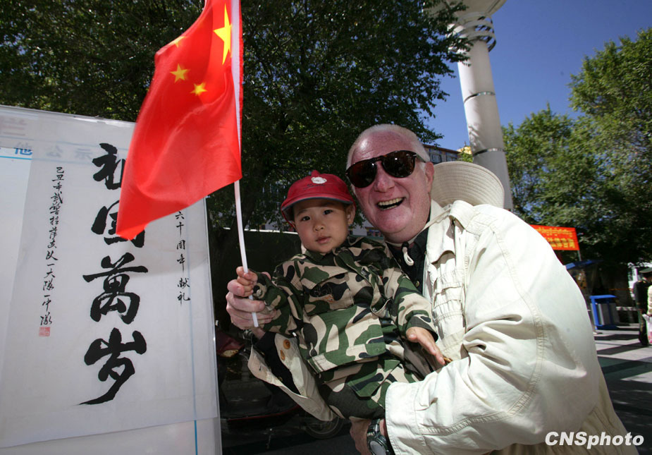 9月27日上午,為迎接國慶60周年,武警西藏總隊官兵為駐地群眾開展擁政愛民、服務群眾便民活動。一位外國游客抱著中國孩子,在武警官兵的書法作品“祖國萬歲”前,一起搖動五星紅旗,共慶新中國國慶60周年。 中新社發(fā) 錢檬 攝