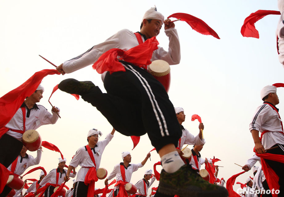 9月16日,千余名來(lái)自陜西安塞的腰鼓隊(duì)員在北京密云訓(xùn)練基地和其他方陣合練。該方陣隊(duì)員全部是來(lái)自陜西省延安市安塞縣的農(nóng)民,10月1日他們將走在群眾游行隊(duì)伍中,在天安門城樓前舞起安塞腰鼓。該方陣也是群眾游行隊(duì)伍中唯一一支京外隊(duì)伍,唯一一個(gè)全部由農(nóng)民組成的方陣。 中新社發(fā) 杜洋 攝