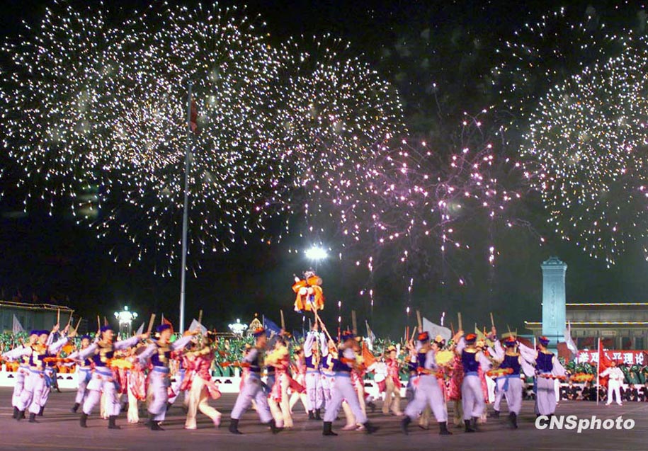 圖為1999年首都國(guó)慶聯(lián)歡晚會(huì),禮花繽紛,場(chǎng)面熱鬧。中新社發(fā) 宗金柱 攝
