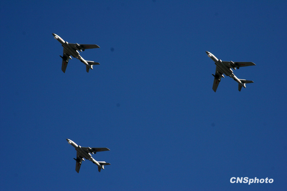 2009年10月1日,中華人民共和國(guó)成立60周年慶祝大會(huì)在北京天安門廣場(chǎng)舉行。圖為轟炸機(jī)梯隊(duì)飛過天安門廣場(chǎng)上空。中新社發(fā) 郭國(guó)權(quán) 攝