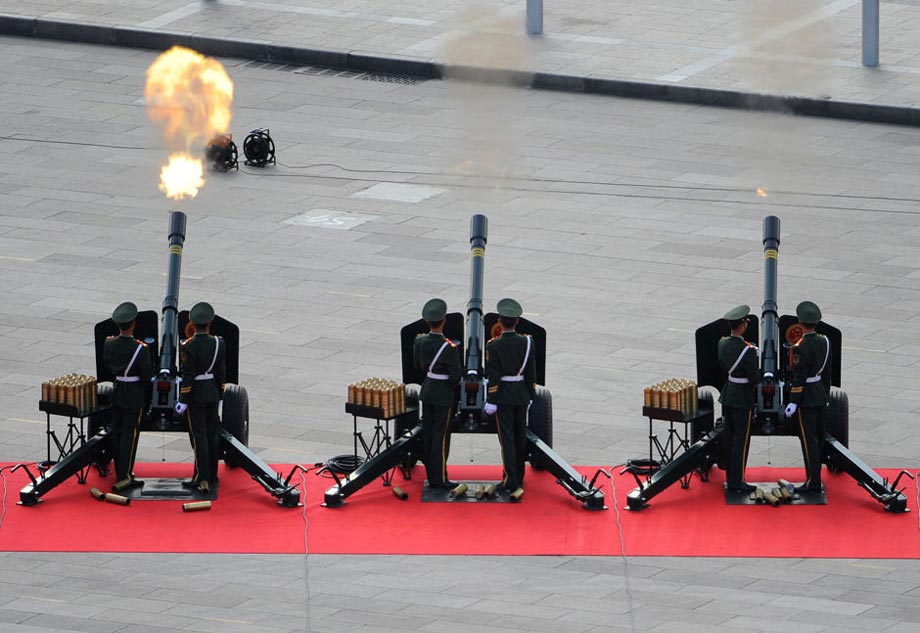 2009年10月1日,中華人民共和國成立60周年慶祝大會(huì)在北京天安門廣場舉行。圖為國慶慶典禮炮在天安門廣場鳴響。圖片來源:新華網(wǎng) 任勇 攝