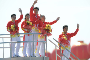 10月1日,中華人民共和國成立60周年慶祝大會(huì)在北京舉行,航天員翟志剛等航天人在群眾游行隊(duì)伍中亮相。 中新社發(fā) 盛佳鵬 攝