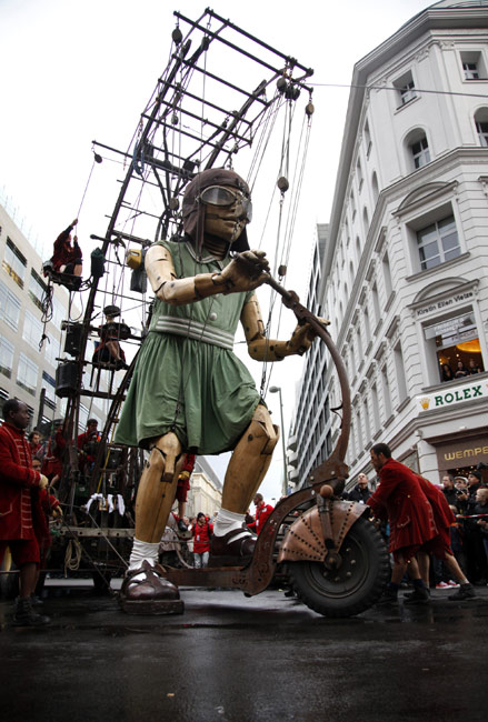 10月2日,來(lái)自法國(guó)一家戲劇公司的兩個(gè)巨型提線木偶亮相柏林街頭,它們將在露天劇場(chǎng)進(jìn)行表演,以此紀(jì)念柏林墻推倒20周年。圖片來(lái)源:中國(guó)新聞網(wǎng)