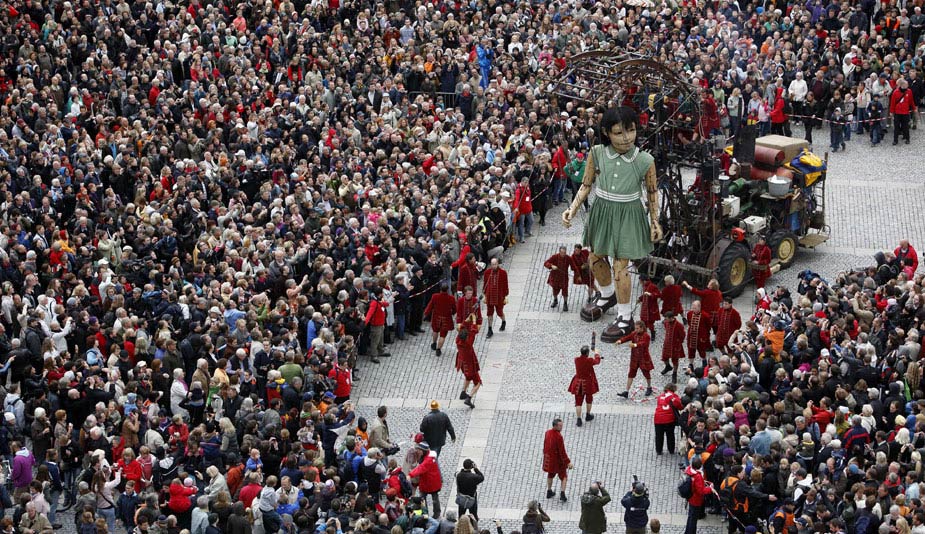 10月2日,來自法國(guó)一家戲劇公司的兩個(gè)巨型提線木偶亮相柏林街頭,它們將在露天劇場(chǎng)進(jìn)行表演,以此紀(jì)念柏林墻推倒20周年。