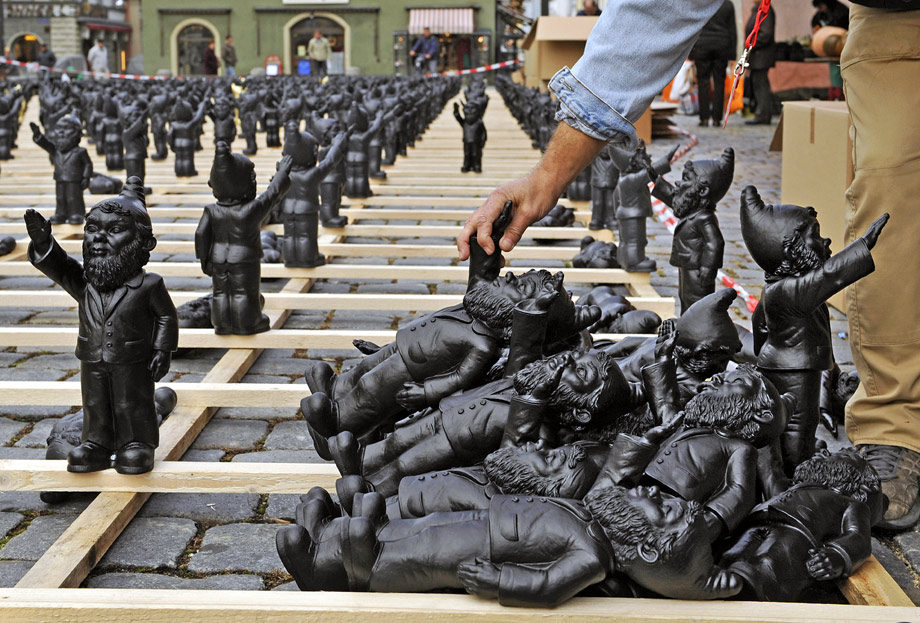 10月14日,德國施特勞賓市街頭擺放了1250個行納粹禮的花園土地神像,“行納粹禮的花園土地神”其實是一款雕塑作品,是由59歲的德國藝術(shù)家奧特馬爾·赫勒爾創(chuàng)作的目的在于提醒人們警惕法西斯思想,反對使用法西斯思想控制大眾。