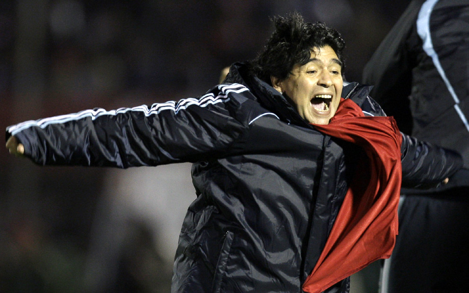 周四(10月15日),2010南非世界杯南美區(qū)預選賽最后一輪比賽中,阿根廷1-0取勝烏拉圭,正式進軍南非世界杯,阿隊主教練馬拉多納狂喜不已。圖片來源:中國新聞網(wǎng)