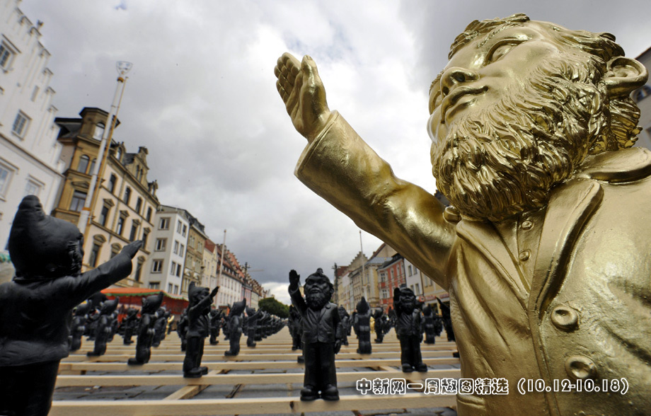 10月14日,德國(guó)施特勞賓市街頭擺放了1250個(gè)“行納粹禮的花園土地神”,目的在于提醒人們警惕法西斯思想,反對(duì)使用法西斯思想控制大眾。圖片來(lái)源:中國(guó)新聞網(wǎng)