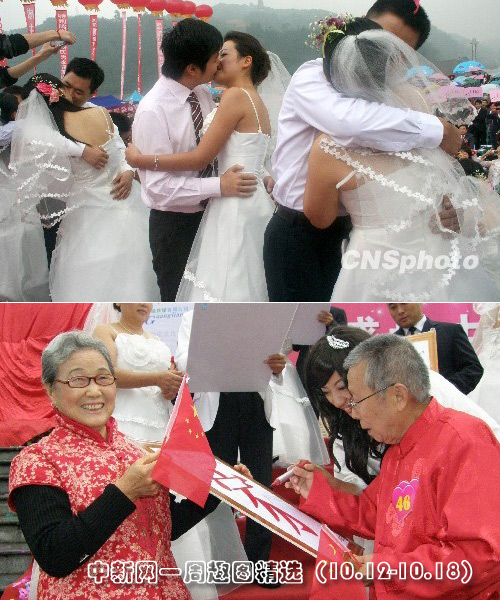 10月12日,享有“萬(wàn)里長(zhǎng)江第一城”美譽(yù)的四川省宜賓市在長(zhǎng)江、金沙江、岷江接合部舉行“盛世中華”集體婚典。圖片來(lái)源:中國(guó)新聞網(wǎng)