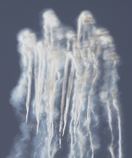 10月20日,韓國(guó)黑鷹特技飛行表演隊(duì)在2009首爾國(guó)際航空航天與國(guó)防展上進(jìn)行精彩的特技飛行表演。