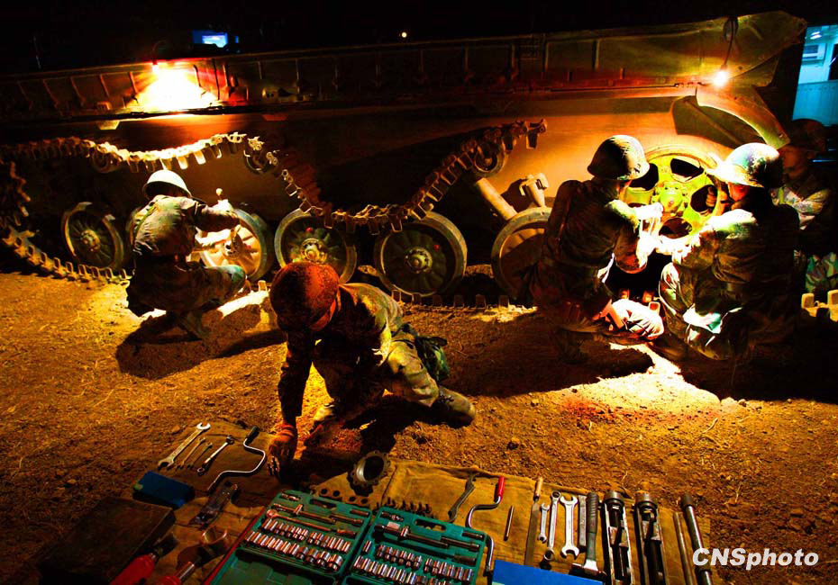 當晚國防大學防務(wù)學院、空軍指揮學院的外軍學員,以及英國、以色列、土耳其、巴基斯坦等國軍事觀察員親臨現(xiàn)場觀摩了后勤保障戰(zhàn)斗準備、自行榴彈炮占領(lǐng)陣地、裝甲車輛“摸黑”開進等戰(zhàn)斗要素。圖為戰(zhàn)地搶修裝甲戰(zhàn)車。中新社發(fā) 宋吉河 攝