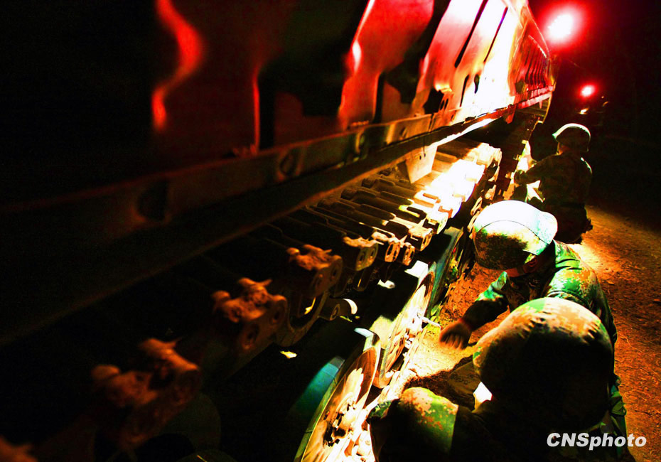 當(dāng)晚國(guó)防大學(xué)防務(wù)學(xué)院、空軍指揮學(xué)院的外軍學(xué)員,以及英國(guó)、以色列、土耳其、巴基斯坦等國(guó)軍事觀察員親臨現(xiàn)場(chǎng)觀摩了后勤保障戰(zhàn)斗準(zhǔn)備、自行榴彈炮占領(lǐng)陣地、裝甲車輛“摸黑”開進(jìn)等戰(zhàn)斗要素。圖為后勤保障基地?fù)屝扪b甲戰(zhàn)車。中新社發(fā) 宋吉河 攝