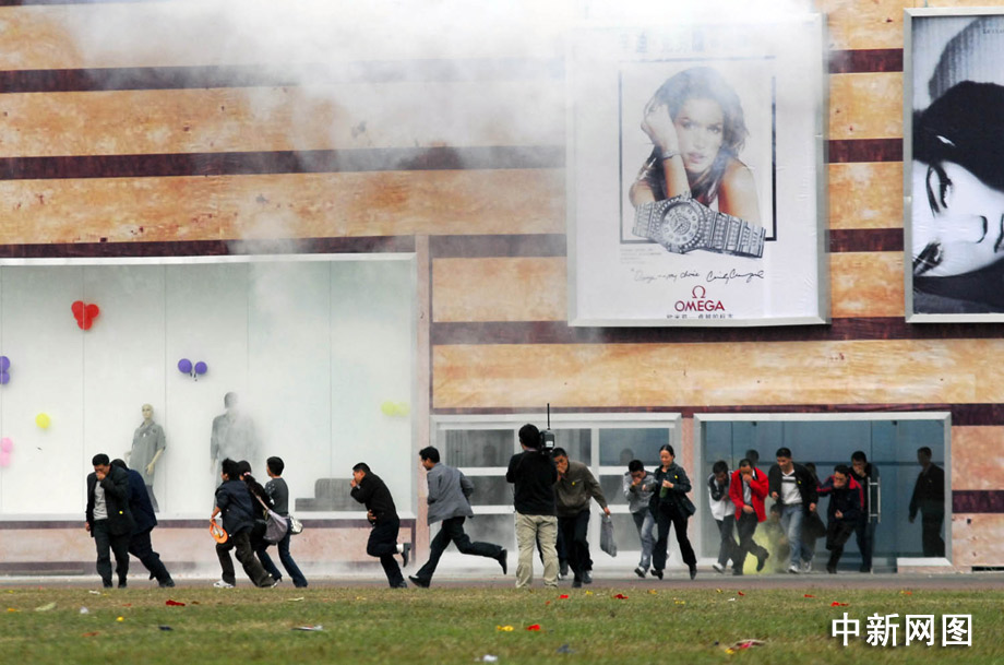 在演練現(xiàn)場,“商場”內(nèi)有毒氣體報警裝置驟然響起,場面發(fā)生混亂,多人中毒倒地。部分群眾感覺呼吸困難,人員咳嗽、嘔吐、倒地,人群中有人呼叫四處逃散,秩序開始混亂起來。
