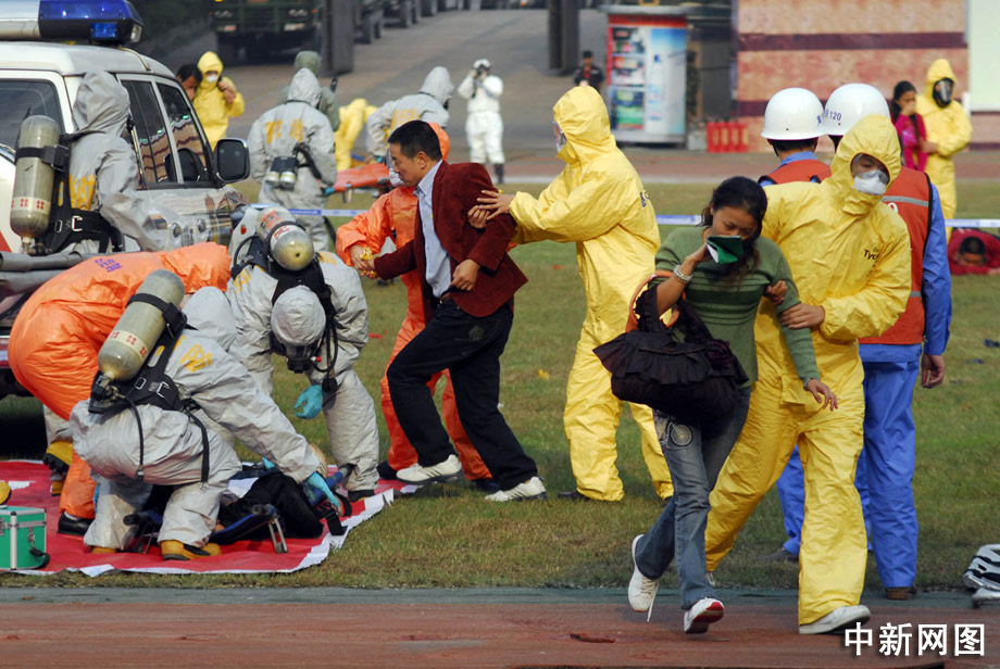 緊隨其后進(jìn)場的是防化醫(yī)學(xué)救援隊。該分隊指揮員帶領(lǐng)后續(xù)偵察分隊、洗消分隊和化驗組,分別乘坐4輛防化偵察車、1輛淋浴車和1輛防化化驗車入場。穿藍(lán)色和橙色防護(hù)服的防化醫(yī)學(xué)救援隊入場后,醫(yī)療衛(wèi)生人員迅速展開裝備,組織檢驗監(jiān)測,開設(shè)臨時醫(yī)療所,區(qū)分觀察區(qū)、檢診區(qū)、洗消區(qū)和處置區(qū),救護(hù)車開始中毒人員轉(zhuǎn)運(yùn)。 郝飛 攝