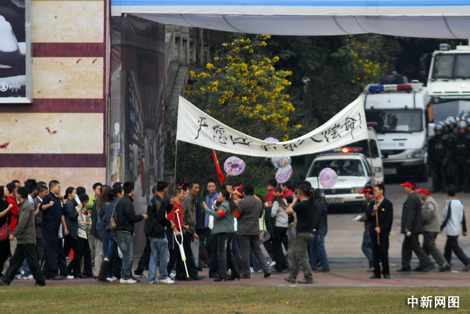 在演練現(xiàn)場,重慶發(fā)生“生化襲擊事件”,偵破工作正在進行時,受害人家屬以賠償和嚴懲兇手為由進行非法游行,堵塞交通和大型商場通道,擾亂交通秩序和正常經營,引來大量群眾圍觀。 郝飛 攝