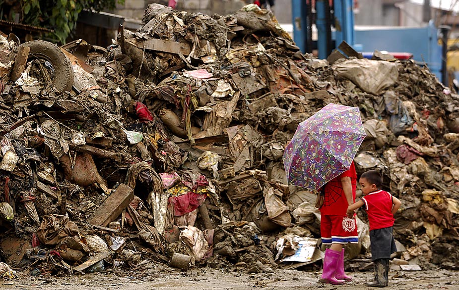 周日(18日),菲律賓馬里基納市一位母親周一帶著孩子走過一堆殘骸。臺風(fēng)“盧碧”使得這個(gè)地區(qū)兩次遭遇暴雨侵襲。 來源:中國新聞網(wǎng)