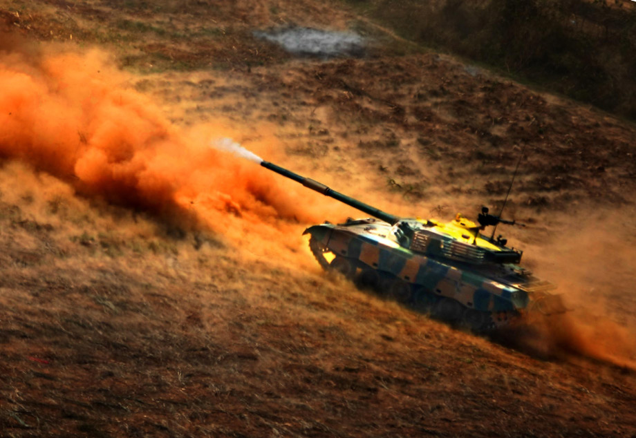 解放軍“前鋒-二00九A”演習(xí),二十二日在濟(jì)南軍區(qū)某合同戰(zhàn)術(shù)訓(xùn)練基地進(jìn)行陸空聯(lián)合火力打擊實(shí)兵實(shí)彈演練。中新社發(fā) 宋吉河 攝