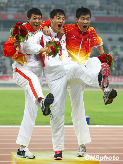 10月25日,在全運(yùn)會田徑男子110米欄決賽中,上海代表團(tuán)選手、“中國飛人”劉翔以13秒34的成績勇奪冠軍,同時也成就了其全運(yùn)會該項(xiàng)目三連冠的偉業(yè)。