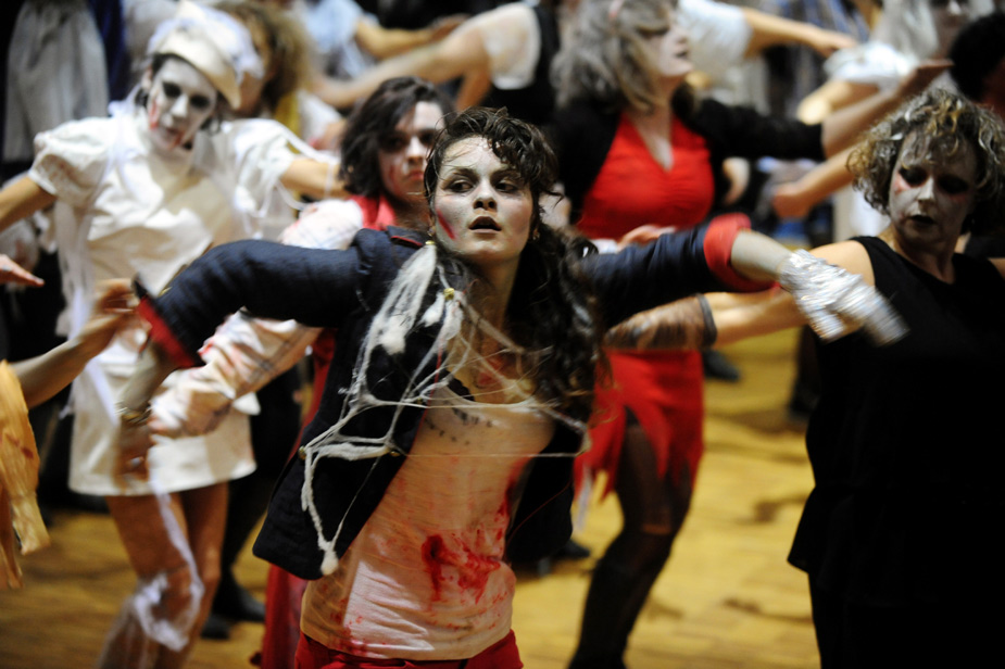 25日,“戰(zhàn)栗全世界”活動在全球300多座城市同期舉行,全球一共有大約20000人同時跳起了邁克·杰克遜著名的戰(zhàn)栗舞。歌迷們借此表達了對這位流行音樂之王的哀思。并且刷新了全世界最多人同時跳舞的世界紀錄。圖為在法國的Gourin,歌迷跳起“戰(zhàn)栗舞”。