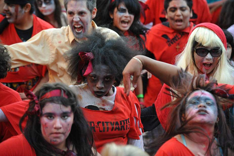 25日,“戰(zhàn)栗全世界”活動在全球300多座城市同期舉行,全球一共有大約20000人同時跳起了邁克·杰克遜著名的戰(zhàn)栗舞。歌迷們借此表達了對這位流行音樂之王的哀思。并且刷新了全世界最多人同時跳舞的世界紀錄。圖為在美國洛杉磯,歌迷跳起“戰(zhàn)栗舞”。