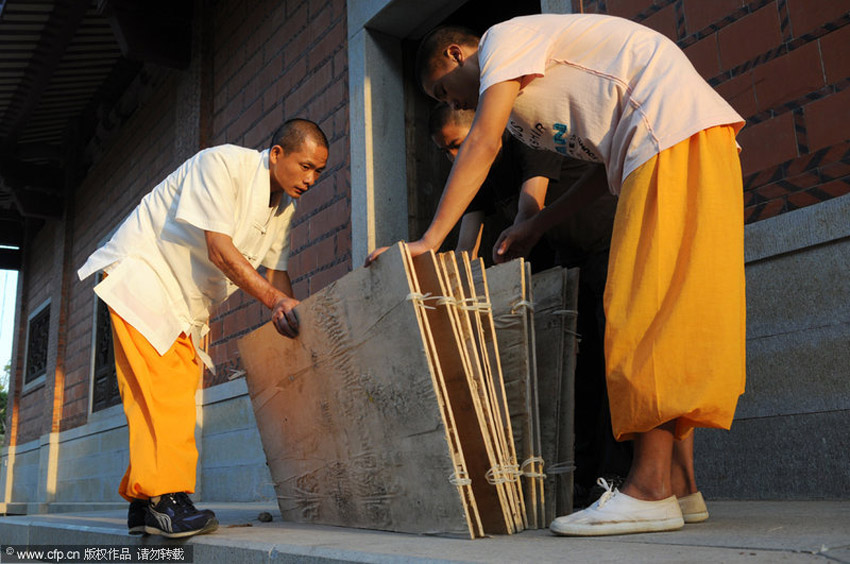 泉州南少林武僧釋理亮借助三合板上演少林絕技“水上漂”,在水面“飛奔”了18米遠。那么,釋理亮的“水上漂”功夫是如何練成的呢?由于訓(xùn)練刻苦,三合板經(jīng)常被踏出洞來,釋理亮不得不在每次訓(xùn)練前認真檢查三合板質(zhì)量。林朝陽/CFP