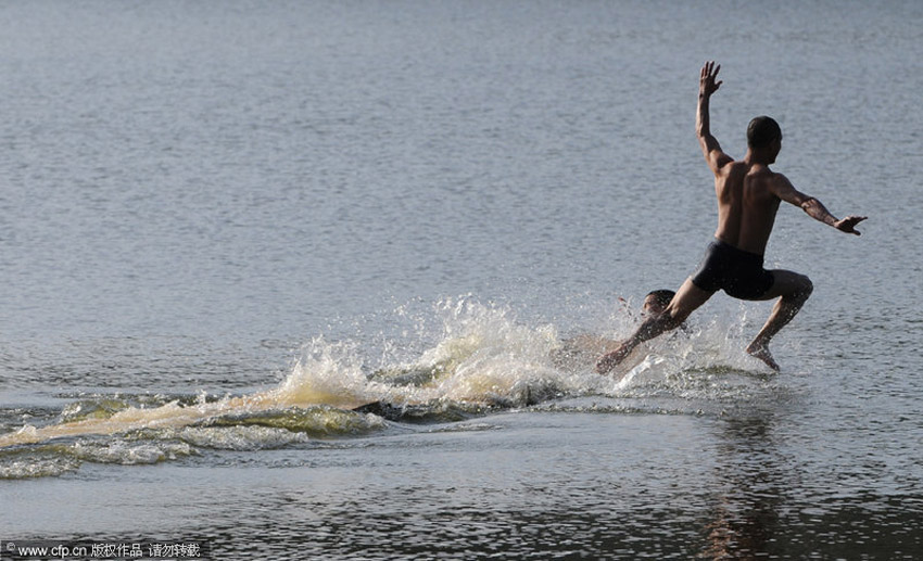 10月22日上午7時許,釋理亮和他的徒弟用塑料尼龍繩將12塊長1.2米、寬60厘米、厚約0.6厘米的輕薄三合板連在一起,在助跑10多米后,如離弦之箭,蜻蜓點水般地跑過三合板,以極快的速度在水面上“飛”了15米遠,整個過程不到5秒鐘。林朝陽/CFP