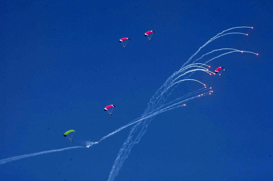 11月3日上午,慶?哲娊ㄜ60周年空中表演在沙河機(jī)場(chǎng)舉行首場(chǎng)預(yù)演。八一跳傘隊(duì)共有24名隊(duì)員表演開路先鋒、空中彩虹、歡慶盛典和仙女下凡4個(gè)節(jié)目。黑克 張穎川 攝