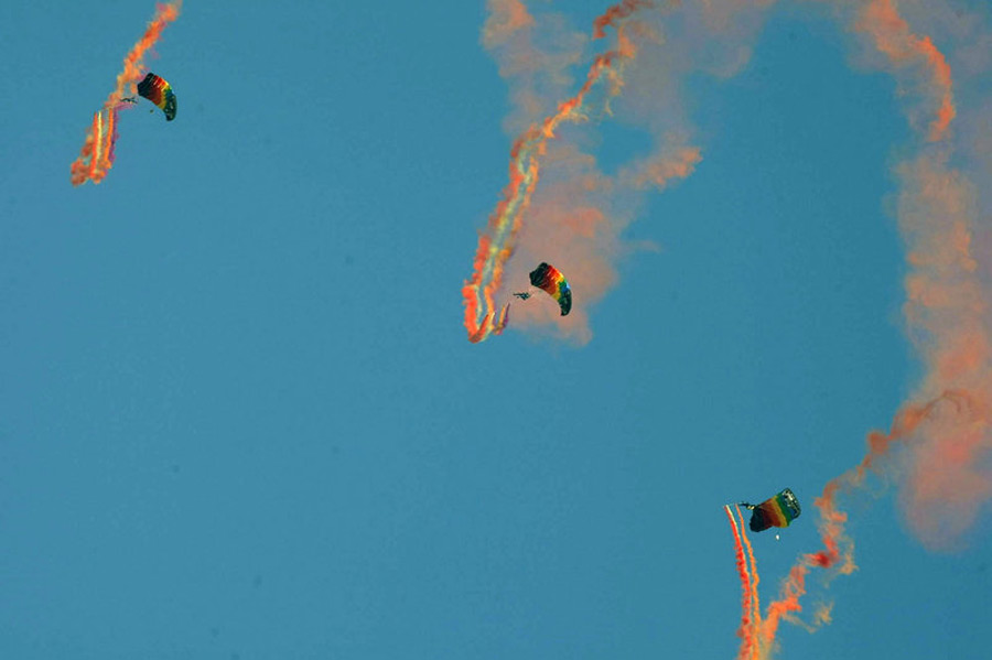 11月3日,空軍八一飛行表演隊(duì)和空軍八一跳傘隊(duì)在北京沙河機(jī)場(chǎng)舉行預(yù)演,迎接中國(guó)人民解放軍空軍建軍六十周年。