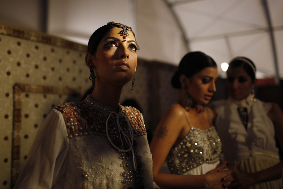 11月5日,巴基斯坦第一屆時(shí)裝周在卡拉奇拉開帷幕。美女模特們身著裸露雙肩和肚臍的非伊斯蘭傳統(tǒng)服裝在T臺(tái)上走秀。