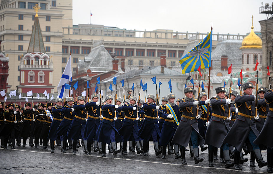 11月7日,俄羅斯士兵身穿二戰(zhàn)時(shí)期的軍服在莫斯科紅場(chǎng)舉行閱兵閱兵式紀(jì)念1941年紅場(chǎng)閱兵。圖片來源:中國(guó)新聞網(wǎng)