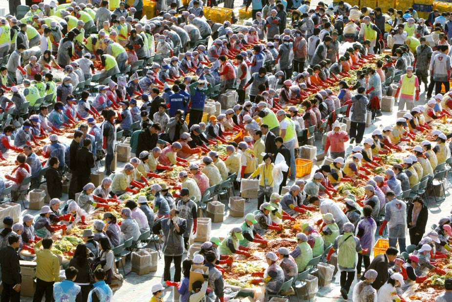 11月9日,約2700名韓國志愿者在首爾一所學(xué)校的操場上制作泡菜。