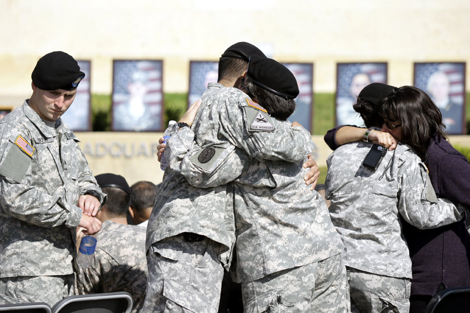 2009年11月10日,美國(guó)德克薩斯州胡德堡陸軍基地舉行儀式悼念槍擊案遇難者。 圖片來源:中國(guó)新聞網(wǎng)