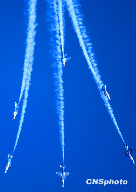 慶祝中國人民解放軍空軍成立60周年飛行表演,11月15日上午在北京沙河機場舉行。表演按八一飛行表演隊4架殲-10飛機表演12個動作和6架殲-7GB飛機表演15個動作,分四機對頭交叉、四機菱形隊大坡度盤旋、單機小速度平飛等27個動作,其中四機對頭交叉動作是這次表演中技術(shù)難度較大的動作之一,這是國產(chǎn)三代飛機和國產(chǎn)二代飛機首次同場競技表演。圖為殲-7GB表演六機向下開花。中新社發(fā) 宋吉河 攝