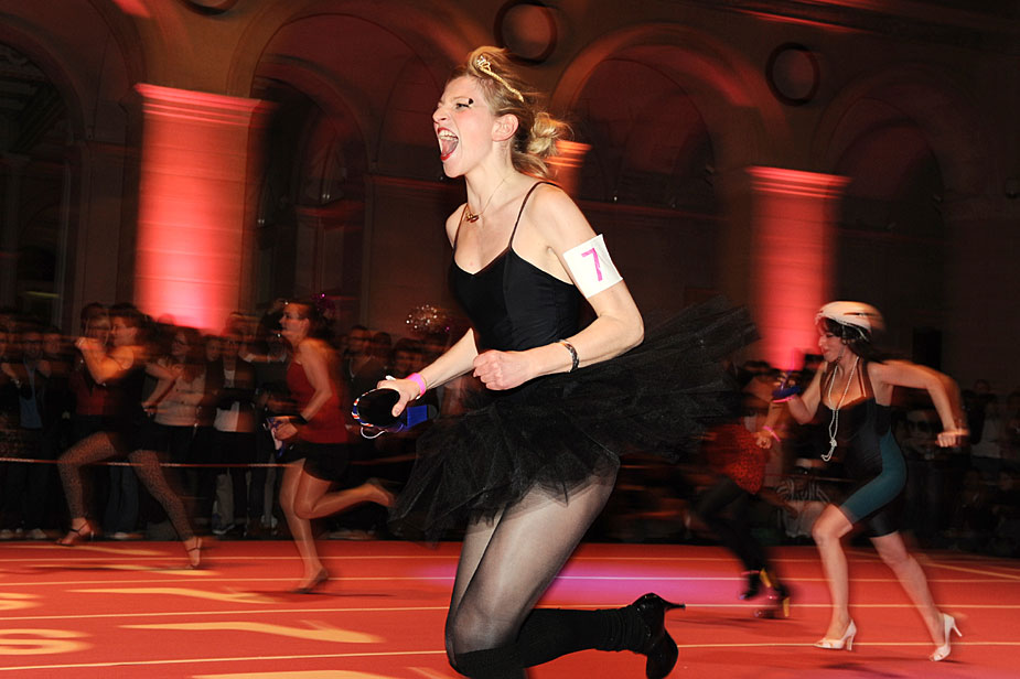 11月20日,法國巴黎舉行了有趣的室內(nèi)高跟鞋賽跑比賽,總共32支隊(duì)伍96人一爭高下。圖片來源:中國新聞網(wǎng)