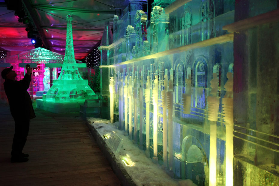 11月23日,為期一個月的“冰之魔術(shù)”藝術(shù)展在法國巴黎香榭麗舍開幕,16位藝術(shù)家利用440噸冰雕刻出精美的巴黎地標建筑和著名藝術(shù)家羅丹的“思想者”雕塑。圖片來源:中國新聞網(wǎng)