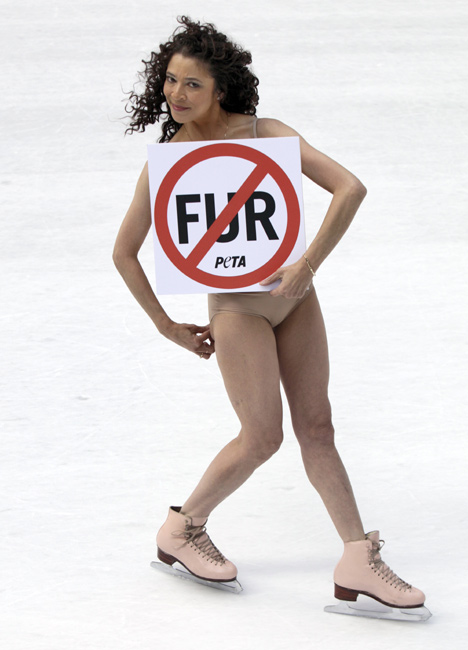 11月24日,美國(guó)花樣滑冰的傳奇人物、1979年世界花滑錦標(biāo)賽冠軍得主芭比洛尼在紐約洛克菲勒廣場(chǎng)復(fù)出“裸滑”。這次表演是為了支持善待動(dòng)物協(xié)會(huì)的反對(duì)皮草行動(dòng)。