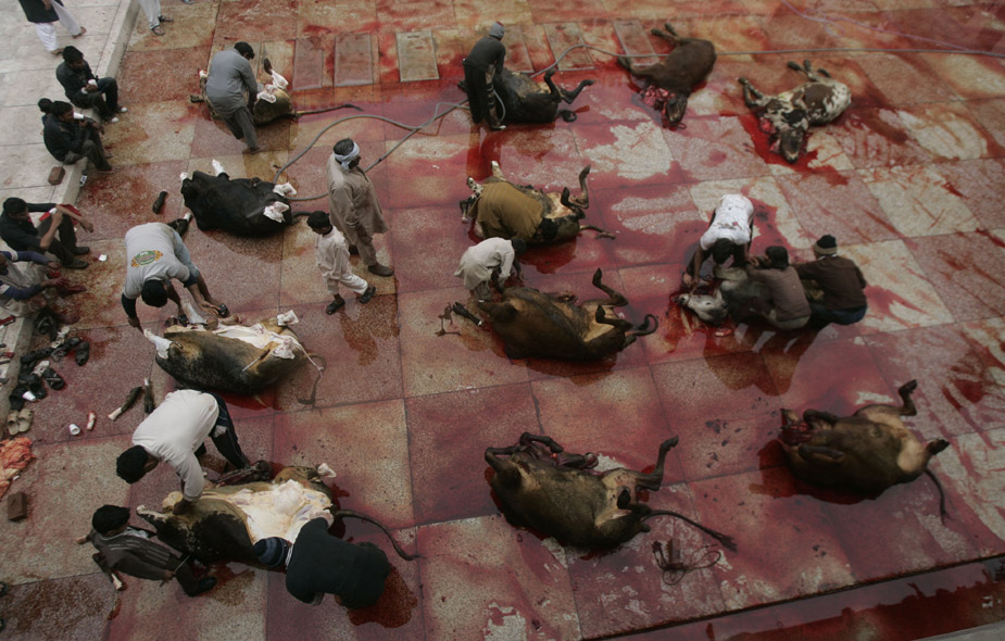 11月28日,世界各國的穆斯林迎來傳統(tǒng)節(jié)日“宰牲節(jié)”。圖為巴基斯坦的穆斯林在宰牲節(jié)上宰殺牲畜。