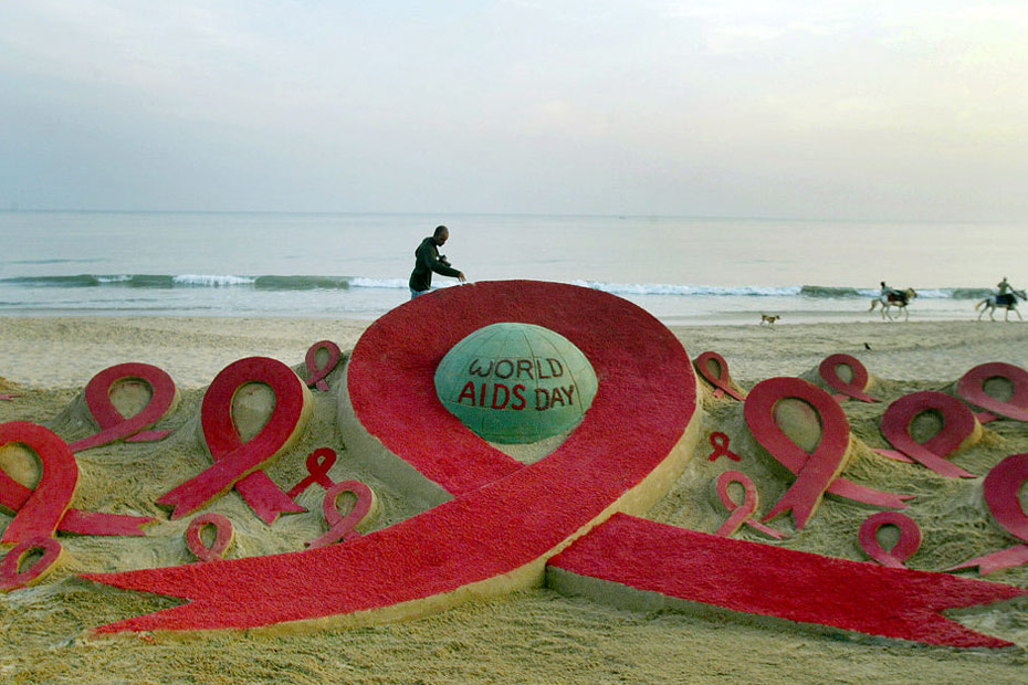 11月30日,印度邦布里,一名藝術(shù)家為世界艾滋病日在海灘上制作了紅絲帶主題沙雕。12月1日是世界艾滋病日,2009年世界艾滋病日的主題是“普遍可及和人權(quán)”。世界各地民眾組織各種活動(dòng)呼吁人們關(guān)注艾滋病。圖片來源:中國新聞網(wǎng)